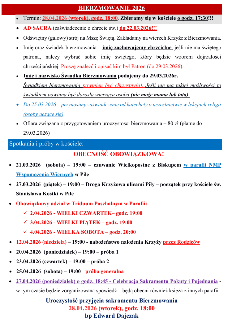 Przygotowanie do przyjęcia sakramentu bierzmowania rozpoczyna się w II półroczu 7 klasy szkoły podstawowej (dawniej II klasy gimnazjum). Rodzice wraz z kandydatem, po wcześniejszym ustaleniu, spotykają się na indywidualną rozmowę z duszpasterzem.